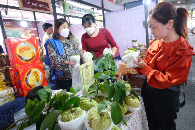 Quả na giống Thái canh tác ở nông trường sông Hậu (huyện Cờ Đỏ, thành phố Cần Thơ) được giới thiệu tại hội chợ. Ảnh: Thanh Liêm - TTXVN