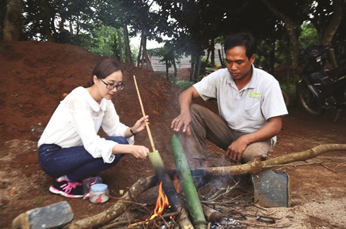 Người M’Nông dùng thanh tre thọc vào ống lồ ô làm nhuyễn thức ăn, tạo ra món canh thơm, ngon, mang đậm hương vị đặc trưng của núi rừng Tây Nguyên.