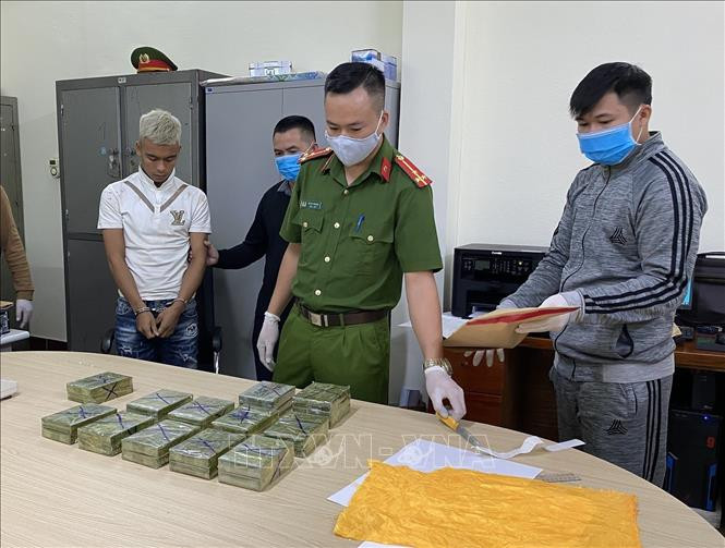 Đối tượng Nguyễn Văn Thuỷ cùng tang vật 25 bánh heroin đang bị bắt giữ tại cơ quan điều tra. Ảnh: TTXVN phát