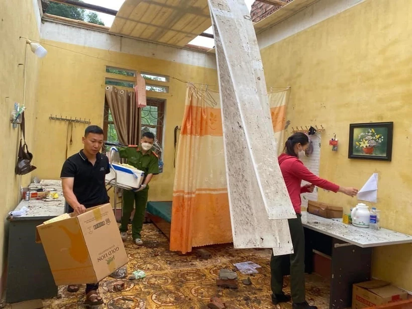Gió lốc, mưa lớn làm tốc mái nhà ở xã Mã Ba, huyện Hà Quảng, tỉnh Cao Bằng. Ảnh: TTXVN phát