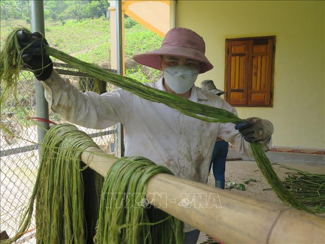Vỏ cây gai xanh được phơi sau khi tuốt. Ảnh: Nguyễn Cường - TTXVN