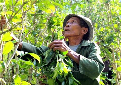 | Đồng bào Hre Minh Long thu hoạch chè trên nương rẫy. Ảnh: Phước Ngọc-TTXVN |
