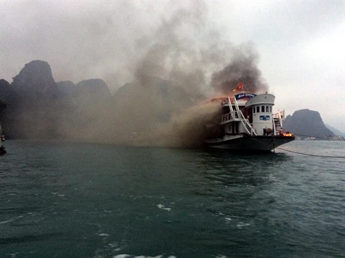 | Hiện trường vụ cháy tàu du lịch ở vịnh Hạ Long. Ảnh: Văn Đức- TTXVN |