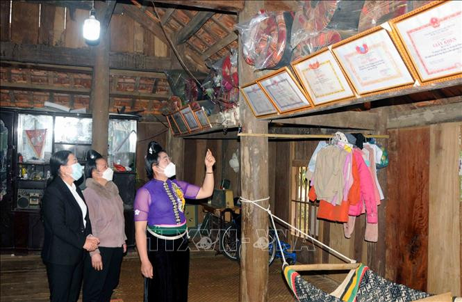 Chị Út (áo tím) đã vinh dự được nhận Bằng khen của Hội Liên hiệp Phụ nữ tỉnh Sơn La vì có thành tích xuất sắc trong học tập và làm theo tư tưởng, đạo đức, phong cách Hồ Chí Minh giai đoạn 2016 - 2021 và nhiếu Giấy khen khác. Ảnh: Quang Quyết - TTXVN