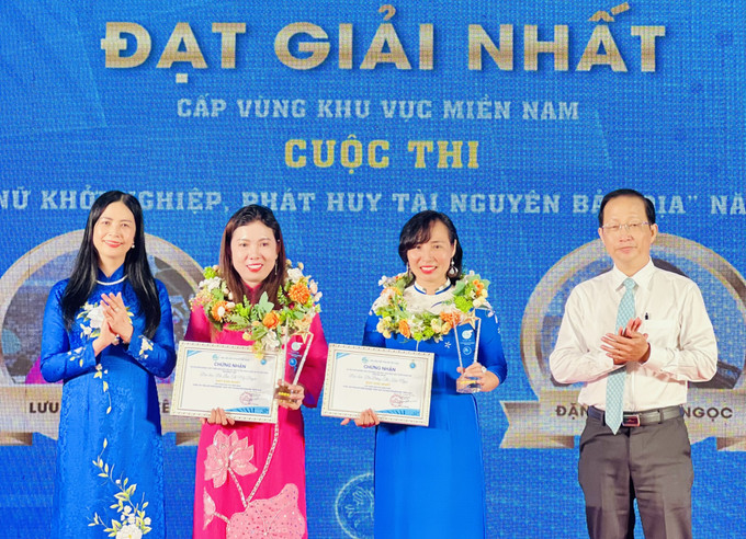 Chị Lưu Thị Mỹ Duyên (thứ 2, từ trái sang) nhận giải Nhất Cuộc thi “Phụ nữ khởi nghiệp, phát huy tài nguyên bản địa” năm 2023 khu vực miền Nam. Ảnh: TTXVN