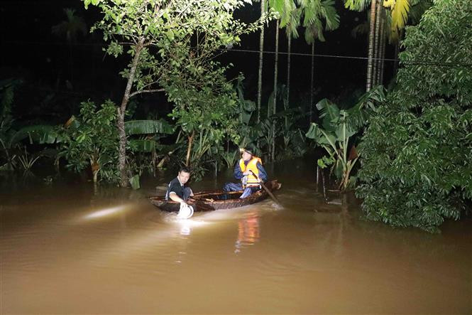 Cứu hộ người dân bị cô lập tại thôn Ngũ Phúc, xã Cẩm Vinh, huyện Cẩm Xuyên, Hà Tĩnh. Ảnh: Vũ Sinh - TTXVN