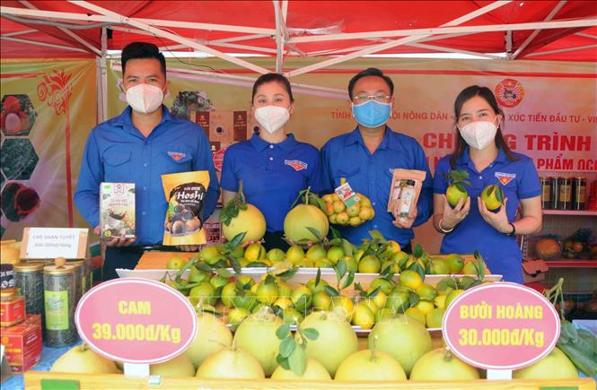 Tỉnh đoàn Sơn La giới thiệu các mặt hàng nông sản của tỉnh Sơn La . Ảnh: Quang Quyết-TTXVN