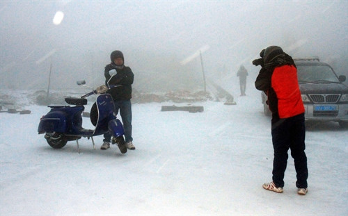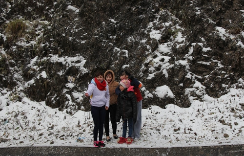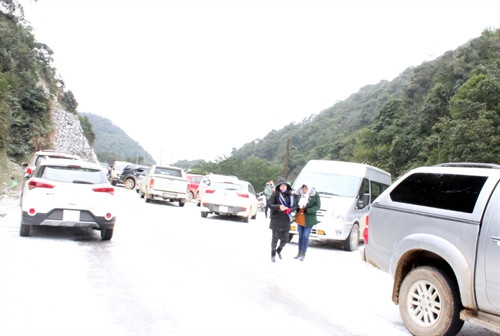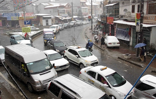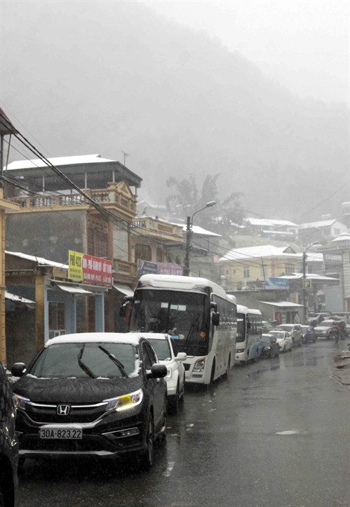 Chiều 24/1/2016, lượng tuyết tại Sa Pa (Lào Cai) tiếp tục rơi dày hơn, phủ trắng thị trấn và các xã lân cận với độ dày tuyết phủ có nơi lên tới 10cm. Rất đông du khách khắp nơi đã đổ về đây để chiêm ngưỡng hiện tượng thiên nhiên kỳ thú này khiến giao thông tại khu vực thị trấn Sa Pa và các xã lân cận ùn tắc nghiêm trọng. Ảnh: TTXVN