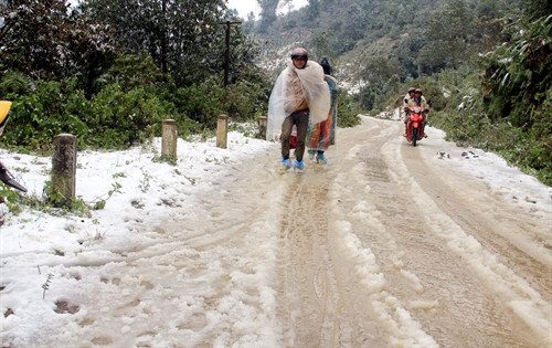 Tại các huyện vùng cao núi đá phía Bắc của tỉnh Hà Giang (thuộc Công viên Địa chất toàn cầu Cao nguyên đá Đồng Văn) từ đêm 23 đến ngày 24/1 đã xuất hiện băng giá và mưa tuyết. Sáng 24/1, tại xã Lũng Cú và thị trấn Phó Bảng (thuộc huyện Đồng Văn), các xã Tả Lủng, Lũng Pù, Xín Cái, Sơn Vĩ, Tát Ngà và thị trấn Mèo Vạc (thuộc huyện Mèo Vạc) nhiệt độ giảm sâu, có nơi xuống dưới -2 độ C và đã xuất hiện băng giá và mưa tuyết dày từ 2-3 cm. Nhiều tuyến đường như: Đường Hạnh phúc từ thành phố Hà Giang đi các huyện Đồng Văn, Mèo Vạc, các tuyến đường từ thị trấn Mèo Vạc đi các xã biên giới, đường từ thị trấn Đồng Văn đi xã Lũng Cú... băng giá và mưa tuyết đã phủ trắng ven đường, gây nhiều khó khăn cho các phương tiện tham gia giao thông. Ảnh: Minh Giáp, Hồng Hải- TTXVN