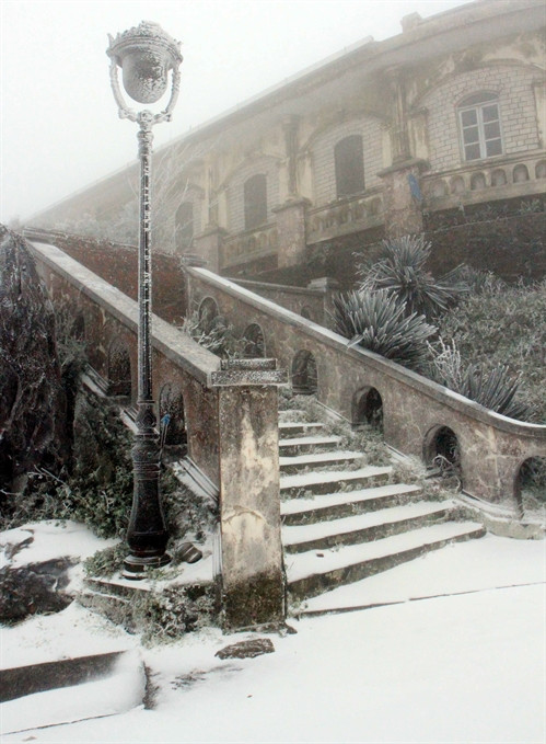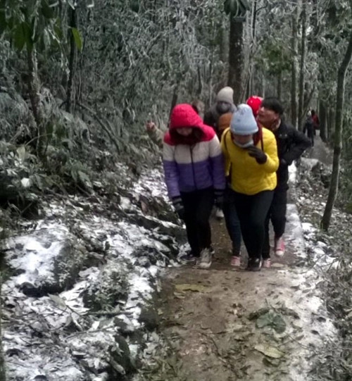 Từ đêm 23/1, nhiệt độ tại Khu du lịch Mẫu Sơn, huyện Lộc Bình, tỉnh Lạng Sơn giảm xuống từ -2 độ C đến -5 độ C và xuất hiện băng tuyết. Đến trưa ngày 24/1, toàn bộ Khu du lịch Mẫu Sơn này đã bao phủ hoàn toàn trong băng tuyết. Đặc biệt trên địa bàn thành phố Lạng Sơn có nhiều nơi cũng xuât hiện băng mỏng đọng trên các mái nhà. Đây là lần đầu tiên xuất hiện băng tuyết tại thành phố Lạng Sơn. Do băng tuyết rơi nhiều, tuyến đường độc đạo từ Quốc lộ 4B lên Khu du lịch Mẫu Sơn đã được lực lượng chức năng huyện Lộc Bình phong tỏa, không để du khách lên xuống khu du lịch bởi đường trơn do băng tuyết bám dày, không đảm bảo an toàn cho các phương tiện đi lại. Ảnh: Thái Thuần- TTXVN