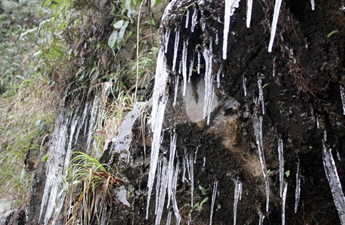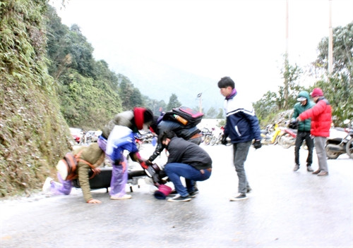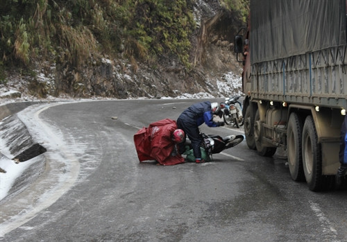 Ngày 24/1/2016, trên Quốc lộ 4D, đoạn từ Km 87 đến Km 112, từ địa phận huyện Tam Đường (Lai Châu) sang Sa Pa (Lào Cai) xuất hiện băng tuyết. Băng đóng dày hơn 1cm và có mưa tuyết rơi.. Ảnh: Nguyễn Duy- TTXVN