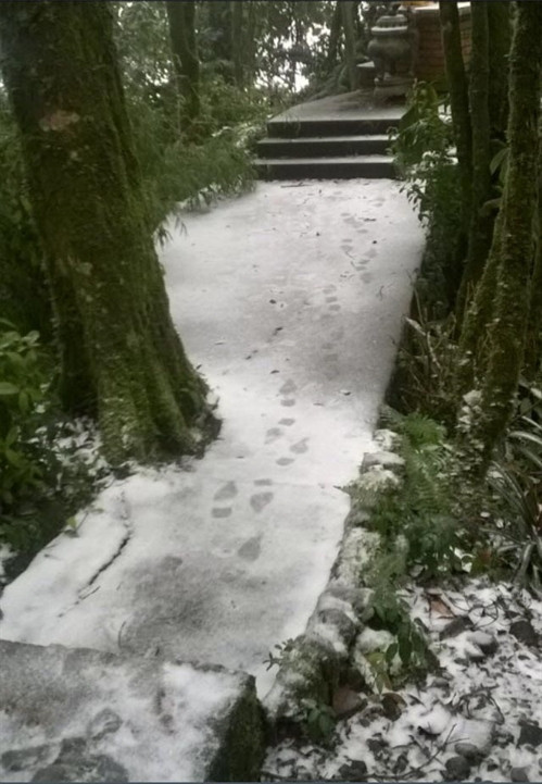 Khoảng 6h sáng 24/1, tại Vườn Quốc gia Ba Vì (Hà Nội) đã xuất hiện tuyết rơi nhiều trên núi Ba Vì. Đây là lần đầu tiên có hiện tượng tuyết rơi ỏ vùng núi Ba Vì. Ảnh: TTXVN
