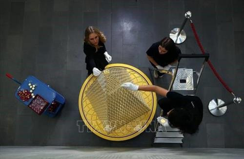 | Nhân viên hãng Pro Aurum ghép các đồng xu vàng để tạo thành cây thông Giáng sinh tại Munich, Đức. Ảnh: Reuters/ TTXVN |