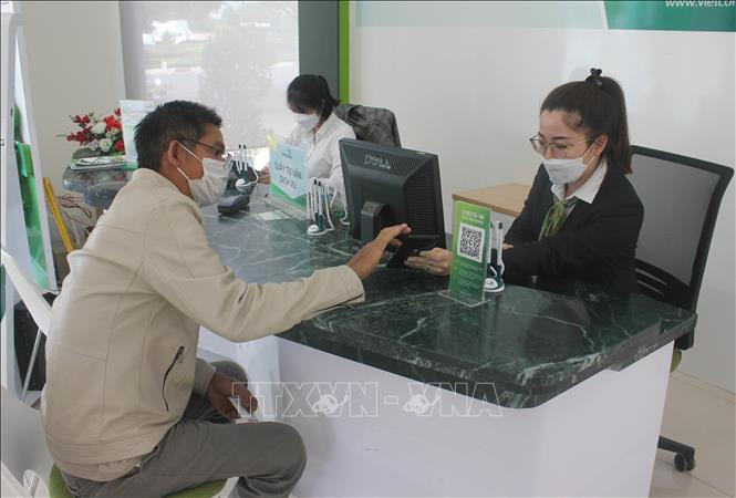 Khách hàng giao dịch tại Ngân hàng TMCP Ngoại thương Việt Nam chi nhánh tỉnh Kon Tum. Ảnh: Dư Toán – TTXVN.