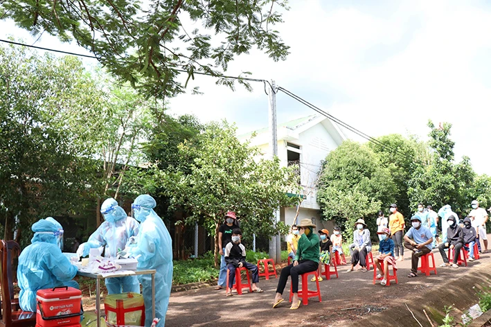 Lấy mẫu xét nghiệm trên diện rộng cho đồng bào dân tộc ở xã Cư Êbur, thành phố Buôn Ma Thuột (Đắk Lắk) sau khi ghi nhận các chùm ca bệnh chưa rõ nguồn lây. Ảnh: Tuấn Anh