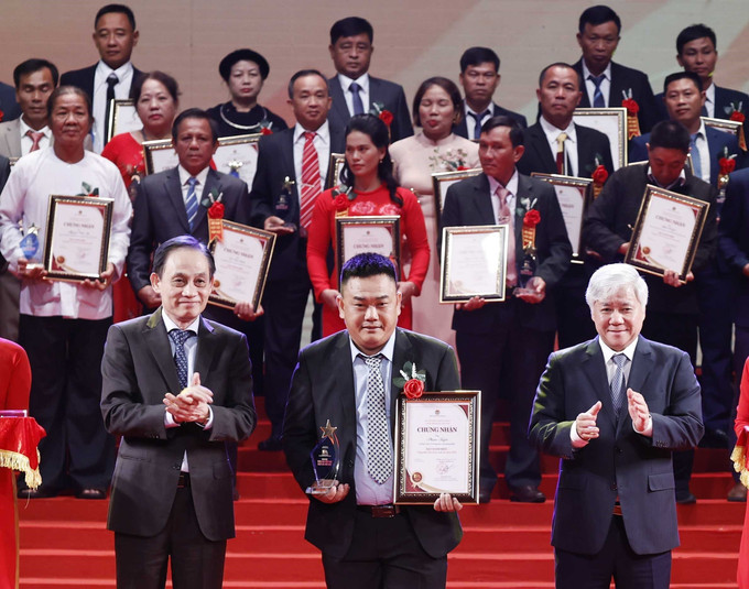 Chủ tịch Ủy ban Trung ương Mặt trận Tổ quốc Việt Nam Đỗ Văn Chiến và Trưởng Ban Đối ngoại Trung ương Lê Hoài Trung trao Danh hiệu Nông dân Việt Nam xuất sắc năm 2022. Ảnh: Thống Nhất – TTXVN