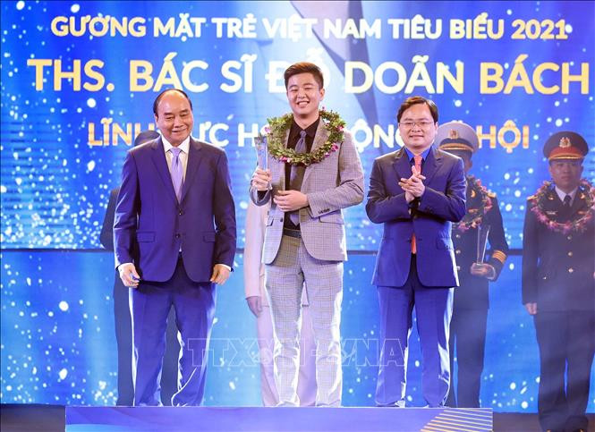 Chủ tịch nước Nguyễn Xuân Phúc và Bí thư thứ nhất TƯ Đoàn Nguyễn Anh Tuấn trao biểu trưng tuyên dương Thạc sĩ, bác sĩ Đỗ Doãn Bách, Gương mặt trẻ Việt Nam tiêu biểu năm 2021 trong lĩnh vực hoạt động xã hội. Ảnh: Thống Nhất – TTXVN
