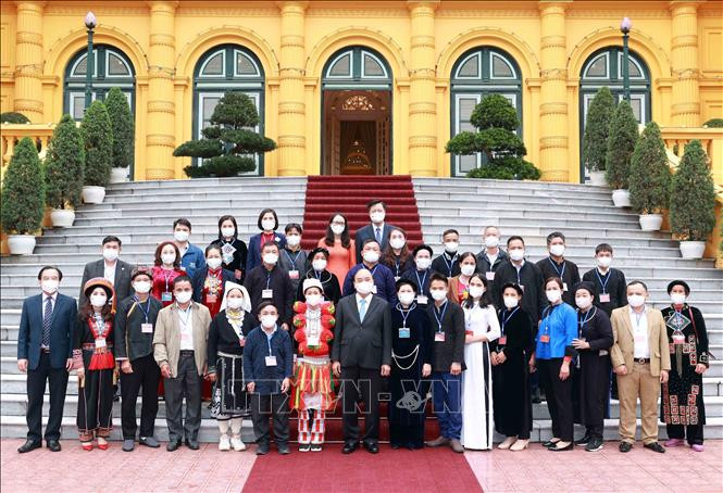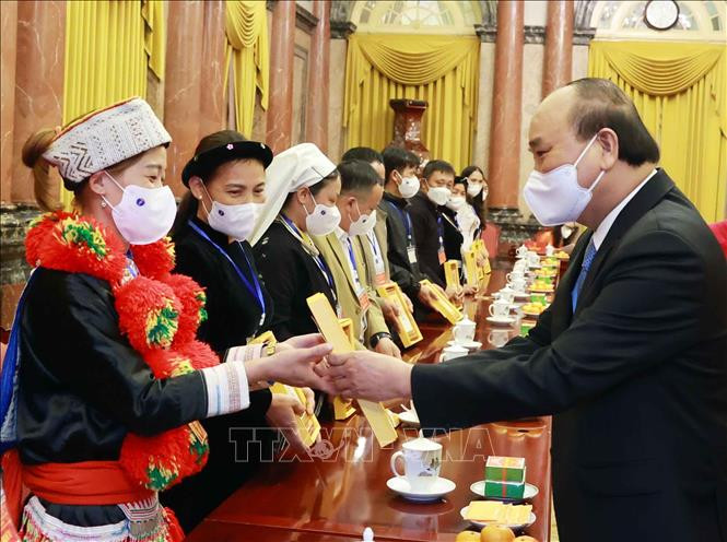 Chủ tịch nước Nguyễn Xuân Phúc gặp mặt Đoàn đại biểu người có uy tín, trưởng thôn tiêu biểu tỉnh Bắc Kạn. Ảnh: Thống Nhất –TTXVN