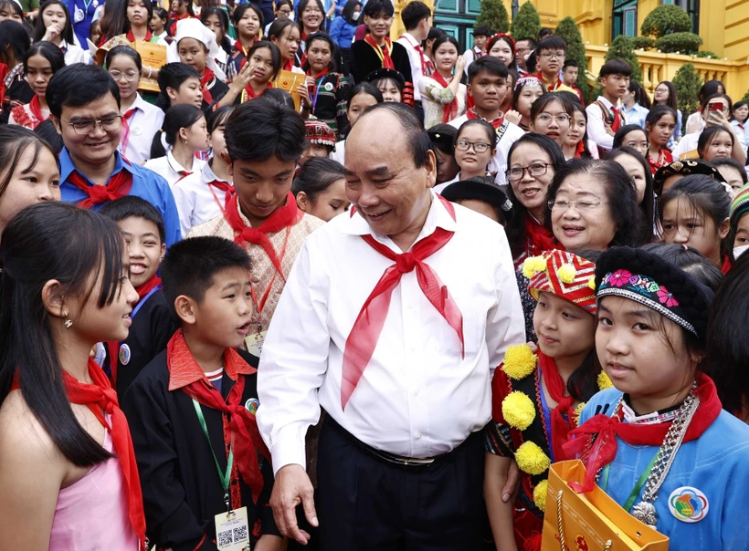 Chủ tịch nước Nguyễn Xuân Phúc với thiếu nhi tiêu biểu các dân tộc toàn quốc. Ảnh: Thống Nhất- TTXVN