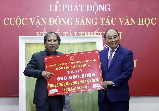 Chủ tịch nước Nguyễn Xuân Phúc trao tặng 600 triệu đồng ủng hộ cuộc vận động sáng tác văn học về đề tài thiếu nhi. Ảnh: Thống Nhất – TTXVN