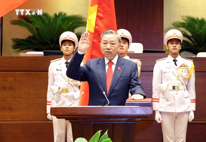Dưới cờ đỏ sao vàng thiêng liêng của Tổ quốc, trước Quốc hội và đồng bào cử tri cả nước, Chủ tịch nước Tô Lâm tuyên thệ tuyệt đối trung thành với Tổ quốc, với nhân dân, với Hiến pháp nước Cộng hòa xã hội chủ nghĩa Việt Nam; nỗ lực phấn đấu hoàn thành tốt nhiệm vụ được Đảng, Nhà nước và nhân dân giao phó.