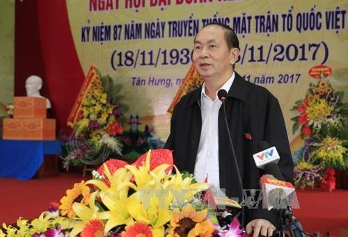 Khẳng định đại đoàn kết toàn dân là sức mạnh cội nguồn của dân tộc, Chủ tịch nước Trần Đại Quang mong muốn, cấp ủy, chính quyền, Mặt trận Tổ quốc, các đoàn thể và nhân dân xã Tân Hưng tiếp tục phát huy truyền thống đoàn kết, đồng lòng quyết tâm phấn đấu giữ vững và nâng cao chất lượng xây dựng môi trường sống an toàn, xanh, sạch, đẹp, xây dựng xã ngày càng giàu đẹp, văn minh.