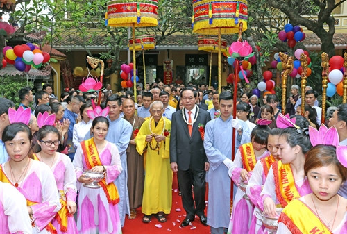 Trong thời kỳ đất nước đẩy mạnh toàn diện, đồng bộ công cuộc đổi mới, xây dựng, bảo vệ và phát triển đất nước, Chủ tịch nước Trần Đại Quang bày tỏ tin tưởng, tiếp nối truyền thống hơn hai nghìn năm gắn bó, đồng hành cùng dân tộc, Giáo hội Phật giáo Việt Nam tiếp tục gìn giữ, phát huy tinh thần “Hộ quốc, an dân” với phương châm “Đạo pháp - Dân tộc - Chủ nghĩa xã hội”; cổ vũ, động viên tăng ni, phật tử ở trong và ngoài nước đoàn kết chặt chẽ với các tầng lớp nhân dân tích cực tham gia bảo vệ vững chắc chủ quyền quốc gia, toàn vẹn lãnh thổ thiêng liêng của Tổ quốc, thực hiện thắng lợi sự nghiệp đổi mới, công nghiệp hóa, hiện đại hóa và hội nhập quốc tế của đất nước.