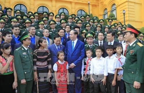 | Chủ tịch nước Trần Đại Quang với các đại biểu cán bộ, chiến sĩ Bộ đội Biên phòng và học sinh tham dự Chương trình "Chia sẻ cùng thầy cô" năm 2017. Ảnh: Nhan Sáng – TTXVN |