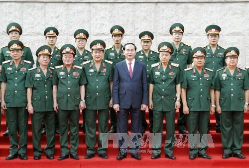 Chủ tịch nước Trần Đại Quang với các cán bộ, sỹ quan chỉ huy Bộ Tư lệnh Quân khu 7. Ảnh: Nhan Sáng-TTXVN