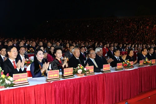 | Chủ tịch Quốc hội Nguyễn Thị Kim Ngân và các đồng chí lãnh đạo Đảng, Nhà nước dự lễ kỷ niệm. Ảnh: Trọng Đức – TTXVN |