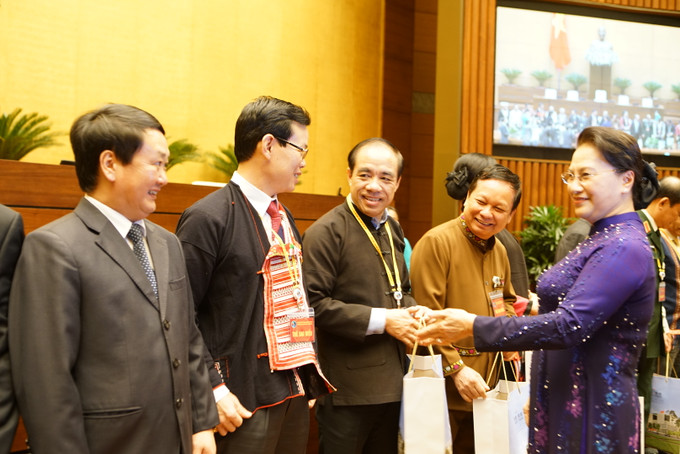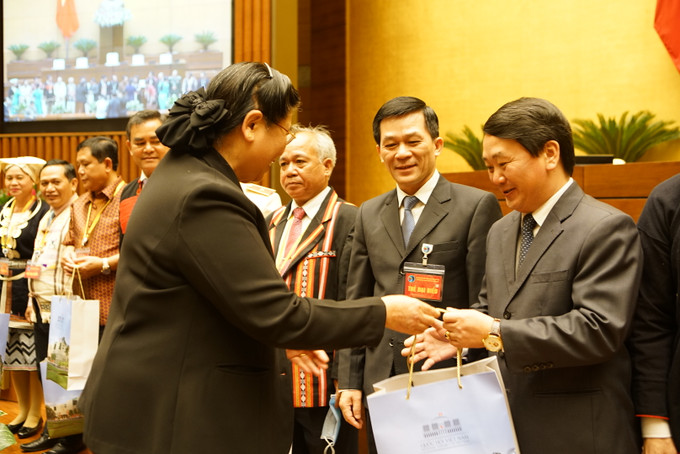 Chủ tịch Quốc hội Nguyễn Thị Kim Ngân tặng quà các đại biểu dân tộc thiểu số tại buổi gặp mặt. Ảnh: Hoàng Hà
