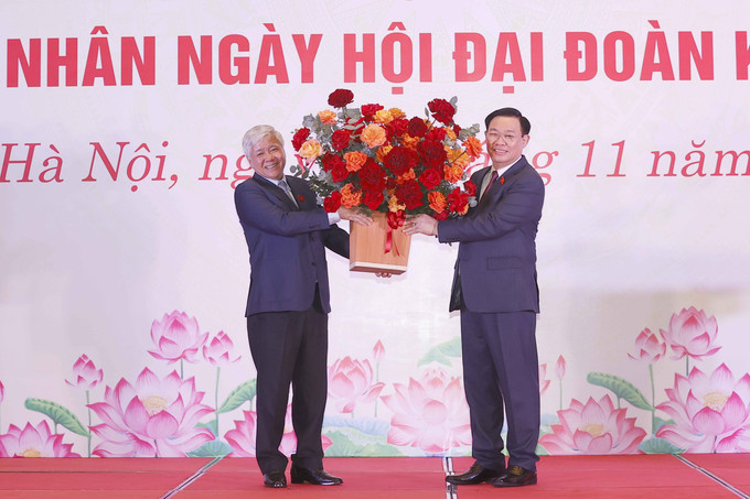 Chủ tịch Quốc hội Vương Đình Huệ trao lẵng hoa đến Chủ tịch Ủy ban Trung ương Mặt trận Tổ quốc Việt Nam Đỗ Văn Chiến nhân Ngày hội đại đoàn kết toàn dân tộc. Ảnh: Doãn Tấn – TTXVN