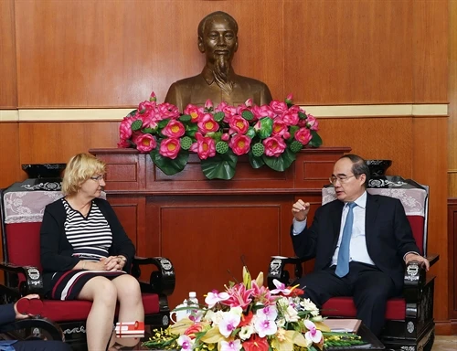 Ủy viên Bộ Chính trị, Chủ tịch Ủy ban Trung ương Mặt trận Tổ quốc Việt Nam Nguyễn Thiện Nhân tiếp bà Karin Hulshof, Giám đốc khu vực Đông Á - Thái Bình Dương của Quỹ Nhi đồng Liên hợp quốc (UNICEF). Ảnh: Nguyễn Dân – TTXVN