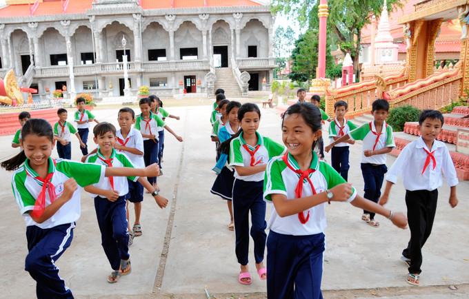 Giờ học giáo dục thể chất của học sinh Khmer Trường tiểu học phường 2, được xây dựng trong khuôn viên chùa Sa La Phô Thi ở thị xã Vĩnh Châu. Ảnh: An Hiếu