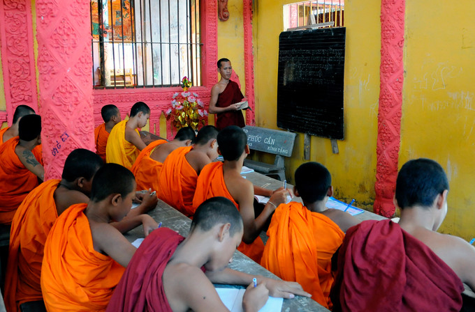 Các chư tăng Khmer theo học tại Trường Bổ túc Văn hóa Pali Trung cấp Nam Bộ ở thành phố Sóc Trăng. Ảnh: Trọng Chính