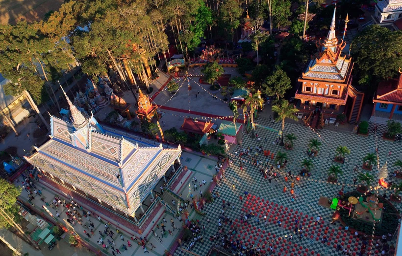 Chùa Sro Lôn (chùa Chén Kiểu) ở xã Đại Tâm, huyện Mỹ Xuyên rộn ràng, lộng lẫy trong những ngày lễ, hội truyền thống của người Khmer. Ảnh: An Hiếu