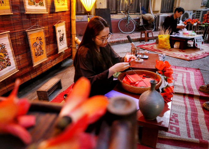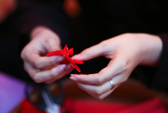 Nghệ nhân gấp hoa gạo bằng giấy. Ảnh: TTXVN