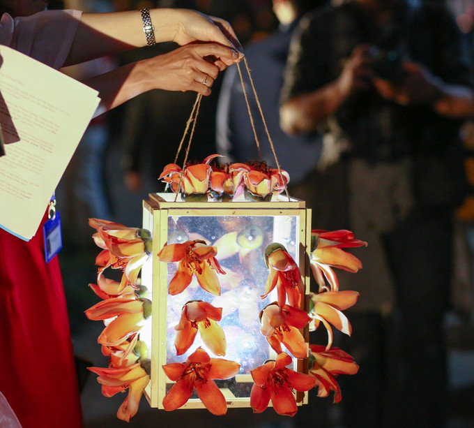 Đèn lồng được trang trí bằng hoa gạo. Ảnh: Thu Phương - TTXVN phát