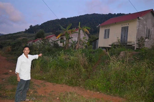 Tương tự, làng Tung, hiện có 73 hộ thì chỉ có khoảng 30 hộ ở làng mới để cho con đi học, còn lại đều quay về làng cũ ở. Ông Đinh Nhâm-Trưởng thôn làng Tung, nói: Năm 2010, bà con về làng mới này ở, được Nhà nước cho làng Tung 25 ha đất sản xuất ở ngay gần khu tái định cư. Thế nhưng, đất có làm được đâu, đất xói mòn lắm, cây trồng không có năng suất, bà con trồng được 1 vụ rồi bỏ không làm nữa. Cả làng giờ phải về làm ở làng cũ. “Vì thế mà nhiều ngôi nhà trong làng cũng bỏ hoang không có ai ở và đang xuống cấp nghiêm trọng. Mới đây, khi thấy cán bộ ngân hàng về đối chiếu lại công nợ để hoàn thiện hồ sơ trong quá trình thực hiện dự án tái định cư, bà con thấy vậy, tưởng phải trả nợ ngân hàng, cả làng đã kéo nhau về làng cũ ở hết”-ông Đinh Nhâm cho biết thêm.