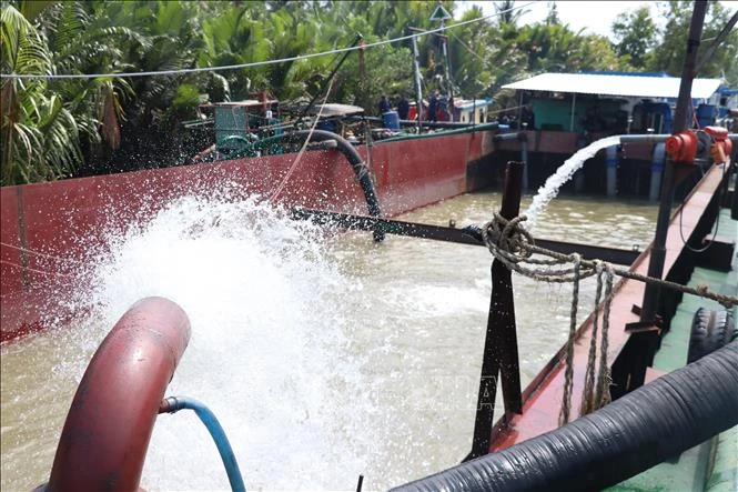 Bơm nước ngọt từ sà lan về Nhà máy nước xử lý. Ảnh: Huỳnh Phúc Hậu - TTXVN
