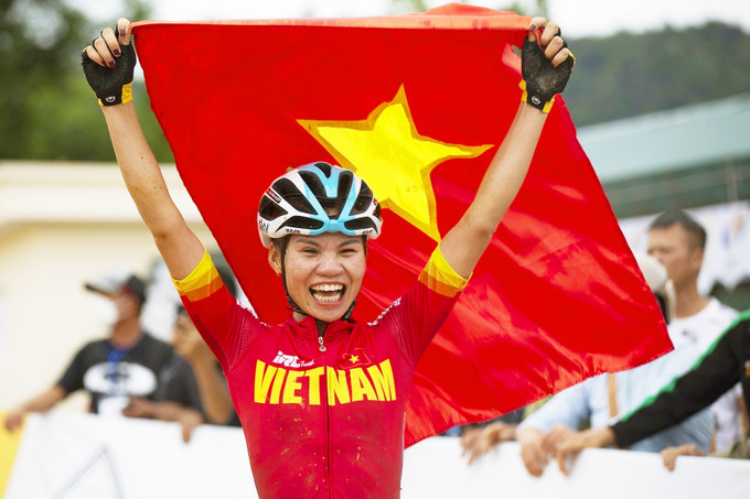 Khoảnh khắc hạnh phúc của vận động viên Đinh Thị Như Quỳnh khi cô bảo vệ thành công tấm Huy chương Vàng nội dung xe đạp địa hình băng đồng nữ Olympic tại SEA Games 31. Ảnh: Lưu Trọng Đạt