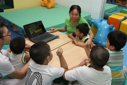 | Cô giáo Lữ Thị Hoa cùng với trẻ trong giờ kể chuyện. . |