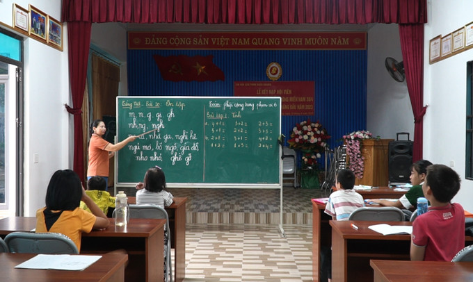 Lớp học của cô Vỵ tại hội trường thôn Ngòi Khang, xã Bảo Ái (Yên Bình, Yên Bái). Ảnh: Việt Dũng - TTXVN