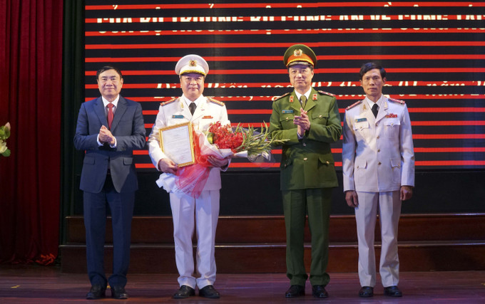 Trung tướng Nguyễn Duy Ngọc, Thứ trưởng Bộ Công an trao Quyết định bổ nhiệm Phó Giám đốc Công an tỉnh Điện Biên cho Thượng tá Lù Văn Phương, Trưởng phòng Tham mưu Công an tỉnh Điện Biên. Ảnh: Xuân Tư – TTXVN