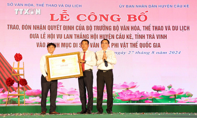 Trong khuôn khổ các chương trình thuộc Festival 100 năm Dừa sáp Trà Vinh và Tuần lễ Vu lan Thắng hội huyện Cầu Kè diễn ra từ ngày 25 - 31/8, tối 27/8, tại huyện Cầu Kè, UBND tỉnh Trà Vinh tổ chức khai mạc Lễ Vu lan Thắng hội huyện Cầu Kè năm 2024; đồng thời, công bố quyết định của Bộ trưởng Bộ Văn hóa, Thể thao và Du lịch công nhận Lễ hội này là Di sản văn hóa phi vật thể quốc gia.
