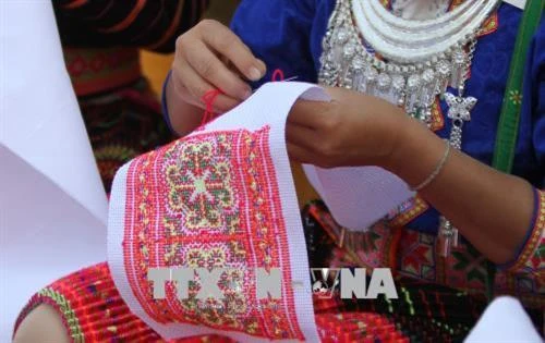 | Phụ nữ Mông ở Sa Lông rất điêu luyện trong việc thêu thùa hoa văn lên trang phục. Ảnh: Xuân Tư – TTXVN |