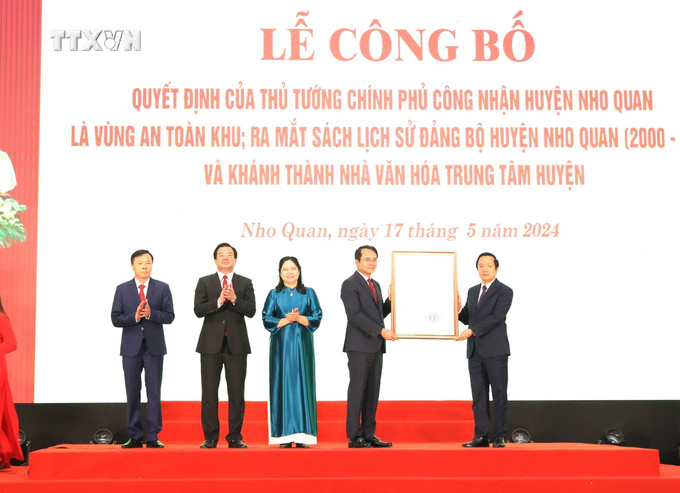 Thừa ủy quyền của Thủ tướng Chính phủ, ông Phạm Quang Ngọc, Phó Bí thư Tỉnh ủy, Chủ tịch UBND tỉnh đã trao Quyết định của Thủ tướng Chính phủ công nhận huyện Nho Quan thuộc tỉnh Ninh Bình là vùng An toàn khu trong thời kỳ kháng chiến chống thực dân Pháp và chống đế quốc Mỹ.