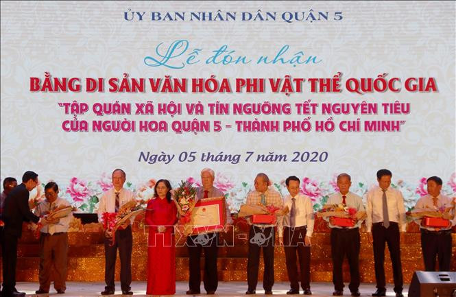 Tối 5/7, Ủy ban nhân dân Quận 5 tổ chức lễ đón nhận bằng Di sản văn hóa phi vật thể quốc gia của Bộ Văn hóa, Thể thao và Du lịch cấp cho “Tập quán xã hội và tín ngưỡng Tết Nguyên tiêu của người Hoa Quận 5, Thành phố Hồ Chí Minh” tại Trung tâm Văn hóa Quận 5.