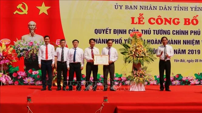 Thừa ủy quyền của Thủ tướng Chính phủ, ông Nguyễn Văn Khánh, Phó Chủ tịch UBND tỉnh Yên Bái trao Quyết định công nhận thành phố Yên Bái hoàn thành nhiệm vụ xây dựng nông thôn mới năm 2019. Ảnh: Tuấn Anh -TTXVN