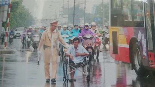 CSGT Đội 4 hỗ trợ người tàn tật qua đường trên phố Đại Cồ Việt |
